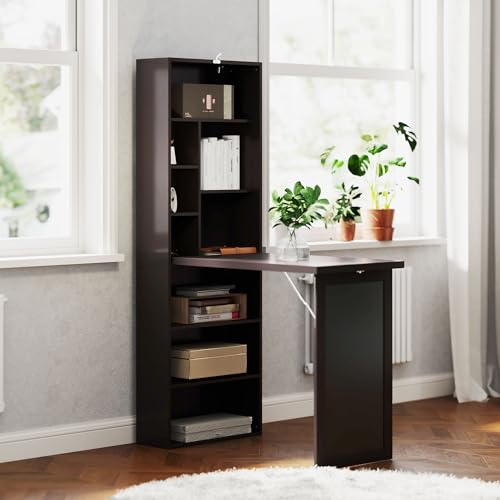 HOMCOM Inklapbaar computerbureau, bureau met opbergruimte, inklapbare wandtafel met boekenkast, werkplek, krijtbord en verstelbare plank